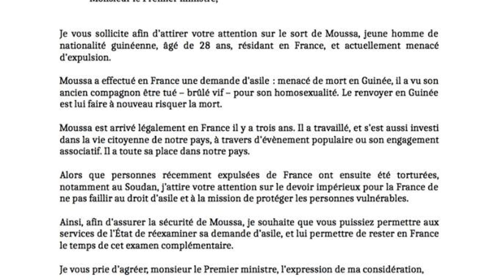 Moussa est un acrobate guinéen que la France veut expulser, l’exposant par là à un danger de mort. Le secrétaire national David Cormand a écrit au Premier ministre pour demander que la situation de Moussa soit réexaminée et qu’il puisse rester en France où il a toute sa place.
